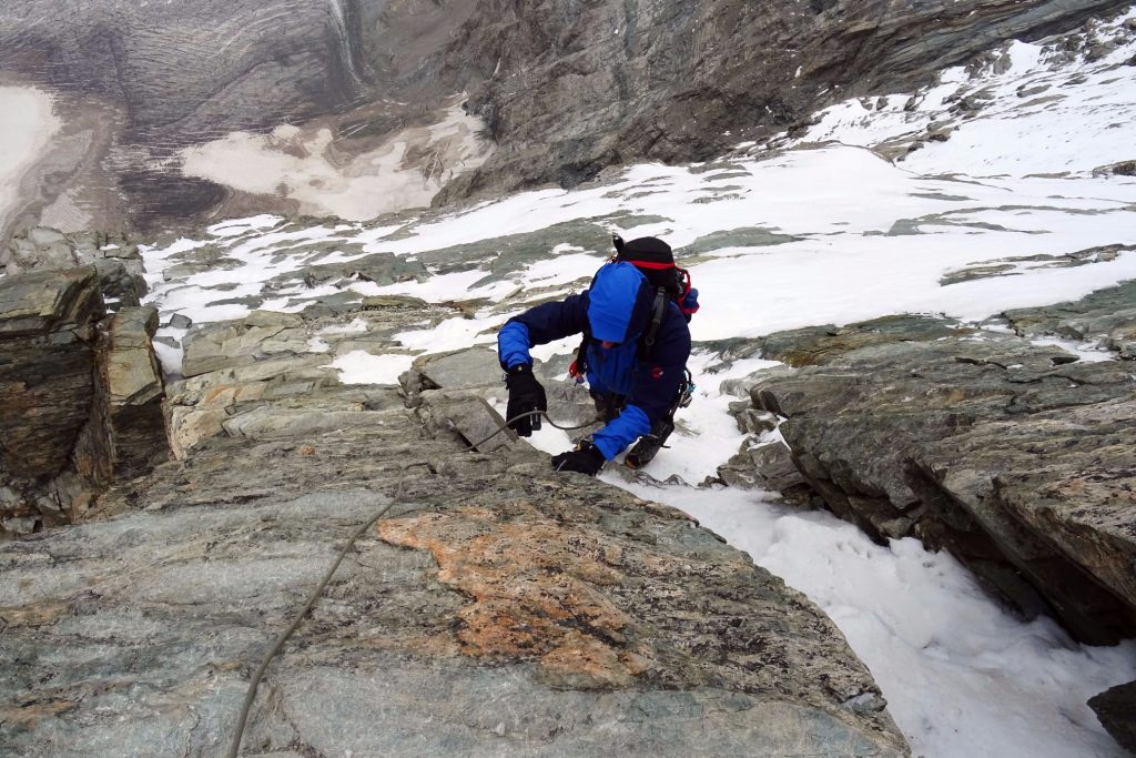 Kratko zadržavanje za fotografisanje, još jednom dodirujem obeležja na vrhu. Zbog lošeg vremena odlučujemo da krenemo odmah nazad. Sa jugozapadne strane se približava oblak koji ne planira da se skloni. Za alpinističke uspone važi da ako uspon ima određenu ocenu, spust ima ocenu više. A ovde je i uspon solidno težak. Alpinistička ocena je samo III UIAA, zbog postavljene užarije, lanaca i lestvi na nekim mestima. Ali i sa svim tim, uspon sa italijanske strane je za ocenu viši nego sa švajcarske strane, zbog strmih uspona, krušljivih stena, čestog prisustva snega i leda i naglih vremenskih promena.