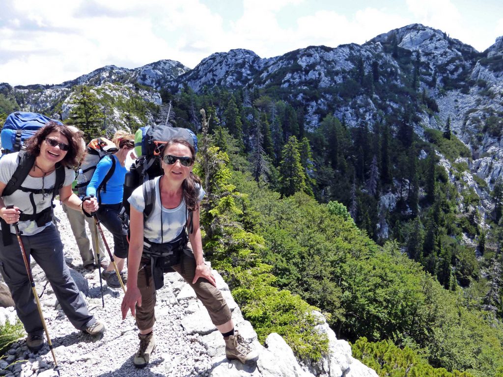 Nakon obilaska Vrta odlazimo u planinarski dom Zavižan na večeru. Zalazak sunca i prvi zajednički sastanak da bi dogovorile logistiku za naredne dane. Irena, kao vođa ovog poduhvata daje nam plan i satnicu pešačenja. Deluje lako, a kako smo svih pet žene u relativno dobroj kondiciji, smatramo da neće biti problema. Plan je da pređemo celu Premužićevu stazu tako da automobile ostavimo na parkingu nacionalnog parka, a taksijem ćemo se vratiti po njih iz Baških Oštarija gde se staza završava. Noćenje je predviđeno u domovima Alan i Kugina kuća. Ceo put traje nepuna tri dana tako da smo spakovale rančeve sa vrećama, nešto hrane i vino koje je bilo višak dok se nosilo, a kada se pilo bilo ga je premalo. Ujutru ustajemo rano, polako se spremamo za polazak, a tada u dom stiže grupa iz Beograda. Srećem draga poznata lica – Maju i Tomicu. Uskoro krećemo, prvo doduše u japankama, ali smo se setile upozorenja HGSS i ipak obuvamo cipele. Prva deonica staze vodi do PD „Alan”, ujedno je i najlepša, duga oko 15 km i na njoj nema vode. Karakteriše je na početku bukova šuma, a kasnije krševit pejsaž sa vrtačama obraslim četinarima poznat kao Rožanski kukovi.